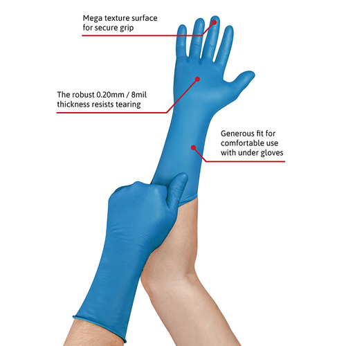Blue nitrile gloves with raised texture surface, offering confident wet, dry and oily grip.